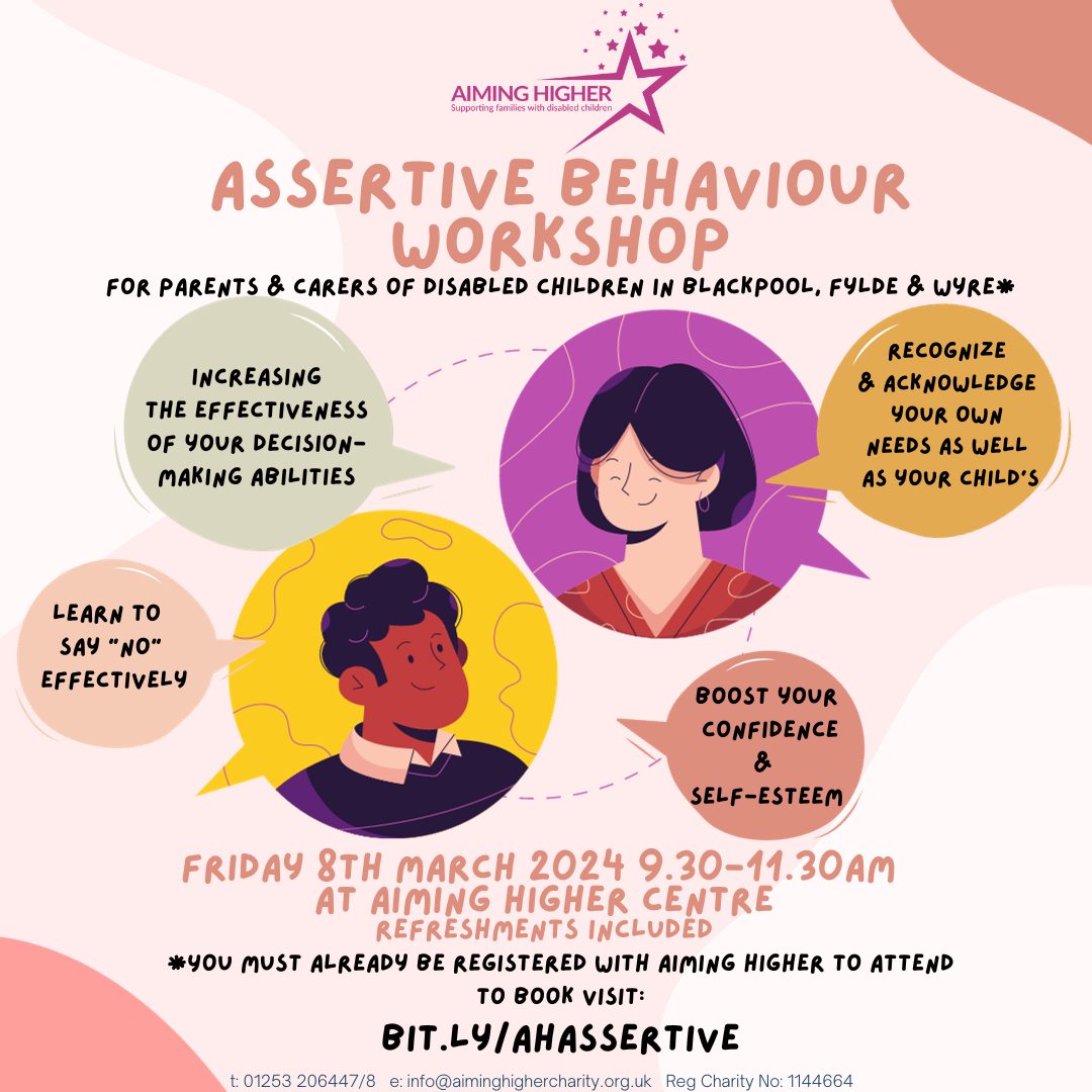 Whether it’s with your children at home, in the workplace or when meeting professionals, it is always useful to be assertive without being confrontational. Join our Reaching Resilience Manager Jenny to learn how to increase the effectiveness of your decision making abilities, learn to say “no” effectively, recognise and acknowledge your own needs as well as those around you, and boost your confidence and self esteem. Booking is required as places are limited. Refreshments included. Parents/carers who are registered with Aiming Higher only, no children please.