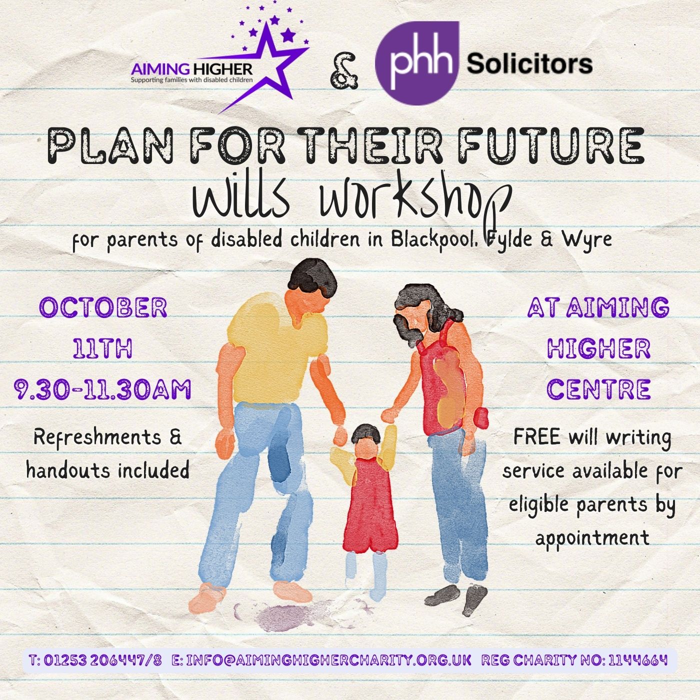 October is Will’s Month and following on from the success of last year’s workshop, we will again be joined by the team from PHH Solicitors to explain why it’s important to make a will even if you don’t have a lot of material goods to leave to anyone. Planning for your child’s future and how you would like them to be cared for if the worst should happen is also important. PHH have generously agreed to offer their will writing service to any families making a donation to Aiming Higher.