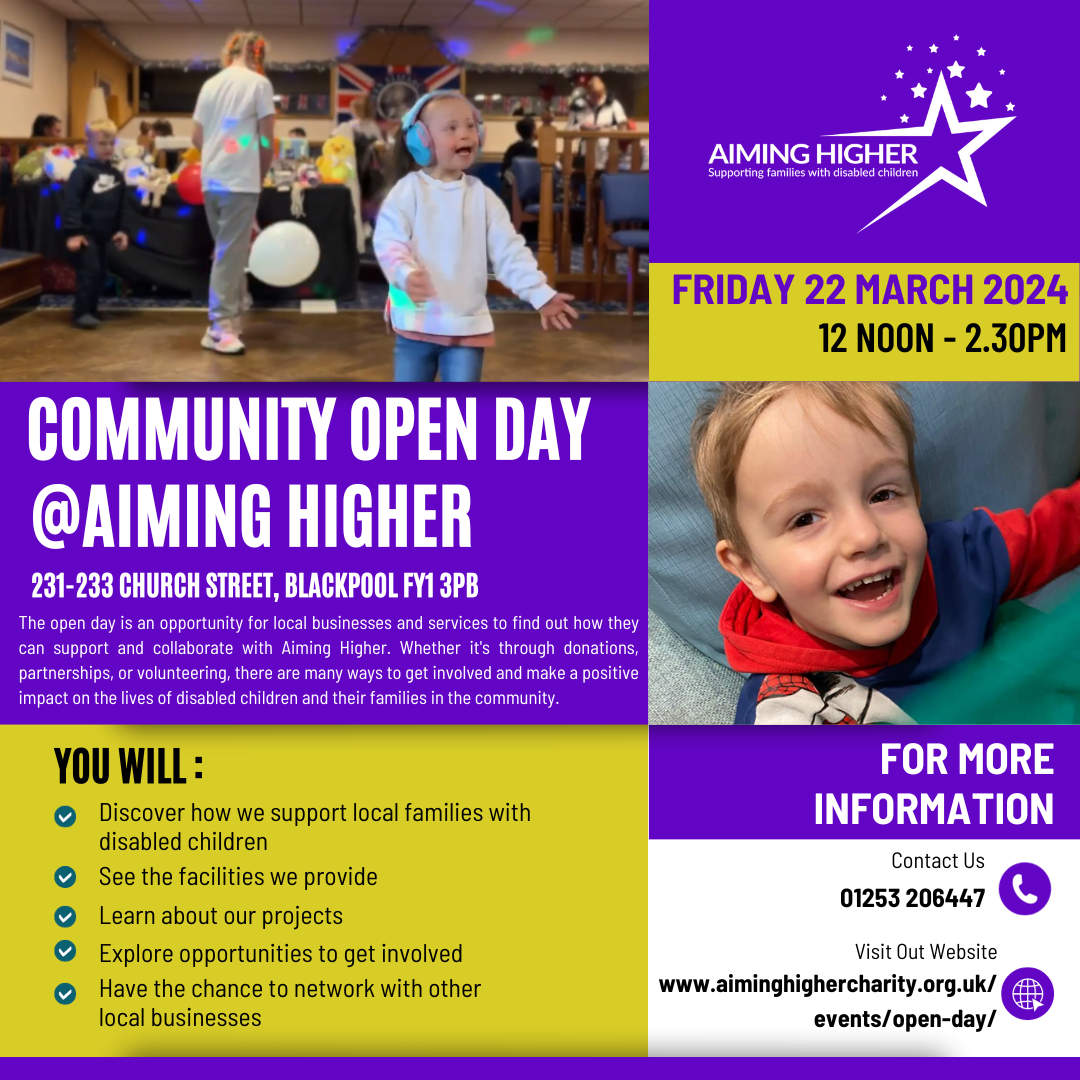 On Friday, 22nd March 2024, Aiming Higher, a charity dedicated to supporting disabled children and their families in the Blackpool and Fylde area, will be opening our doors to businesses and services in the community. From 12 noon to 2.30pm, you are invited to come and learn more about the incredible work that Aiming Higher does and how you can get involved.