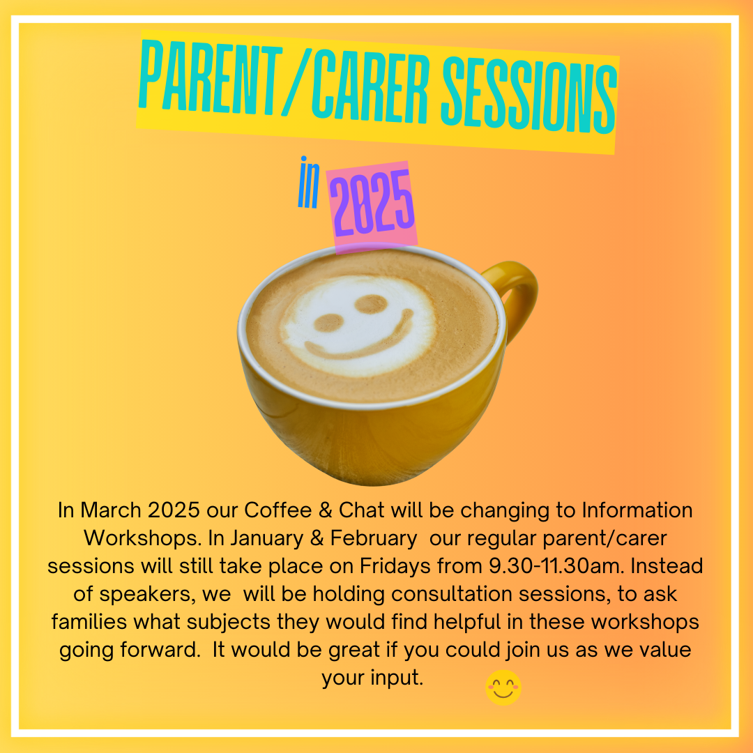 In March 2025 our Coffee & Chat will be changing to Information Workshops. Throughout January & February our regular parent/carer sessions will still take place on Fridays from 9.30-11.30am. Instead of speakers, we will be holding consultation sessions, to ask families what subjects they would find helpful in these workshops going forward. It would be great if you could join us as we value your input. Refreshments available. Please note, these sessions are for parents/carers only and we do not allow children to attend.